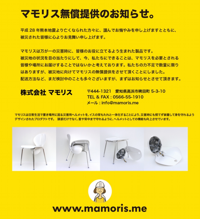 花王株式会社様では多数の方が来館されるミュージアムに、万が一の地震災害に備え来場者向けにヘルメットをまとめて備えていらっしゃいます。今回さらに安全・安心なミュージアムを目指しマモリスを導入して頂きました。マモリスを、休憩椅子やワークテーブルの椅子として館内に分散して設置することで、座っている方がすぐにヘルメットを装着し避難することが可能になりました。お客様の安全・安心を第一に考えられた素晴らしい取組みにマモリスを採用頂き嬉しく思います。